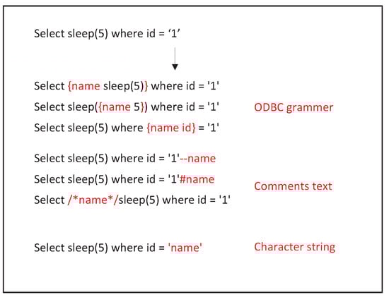 As shown in Figure 7, without changing the functionality of the original payload and breaking the SQL syntax, we chose three points of insertion: the ODBC syntax identification, the comment content, and the string content.