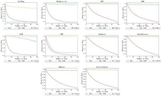 The purpose of this experiment was to verify the effect of SSQLi on the detector attack. Since WAFs did not require training, in contrast to other other learning-based detection models, we first tested the effect of the two WAFs alone, as shown in Table 7. We observed that after being attacked by the adversarial sample, the detection rate of both WAFs decreased dramatically.