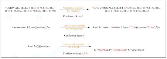 Moreover, as a black-box-attack method, SSQLi automatically adopted different attack strategies for different detection methods without knowing the specific parameters of the detector. As shown in Figure 9, we were able to demonstrate the variation in the adversarial attack models by using SafeDog, ModSecurity, and LSTM as examples.