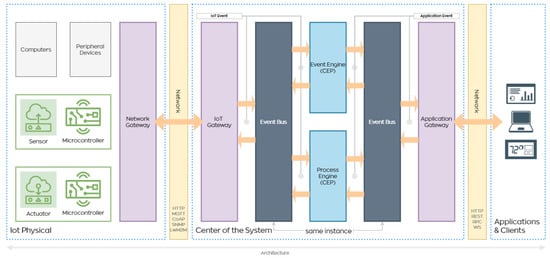 Center of the System []: The Center of the System is the layer that includes all those components that allow the management of the physical world as well as the creation of applications. It establishes communication with the IoT Physical and Applications and Clients layers, provides structures for creating event-driven services, supports interoperability, and ensures the correct flow of data in the direction for which it is intended. The Center of the System is essential for our research and consists of the following components.