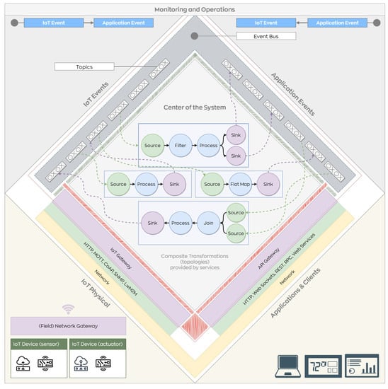 A big issue for many studies in the domain of IoT [,,,,,,], including more general studies as those mentioned before, is management of the massive influx of data generated by devices in the physical environment while sensing and actuating []. Those data are treated as events, as they usually define a significant change in state and must be appropriately processed in a timely and responsive manner. In order to be meaningful in the application context, the events must be transformed. In its broadest definition, a transformation [] refers to any operation that takes as input a single event or stream of events and produces a single event or stream of events as its output. The produced type of event or stream of events usually has different semantics than the input event or stream of events.