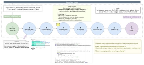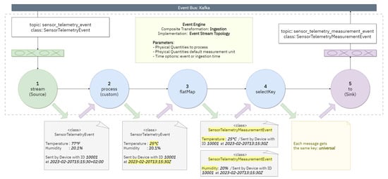 1. stream: Consumption of data stream from the topic “sensor_telemetry_measureme nt_event”, i.e., processed IoT Events, from the Event Bus in order of the time sequence they were stored. In addition, this specific step includes deserializing the message payload from bytes in the format required by Event Engine, i.e., “SensorTelemetryMeasurementEvent”, which can be physically represented as either POJO or JSON.