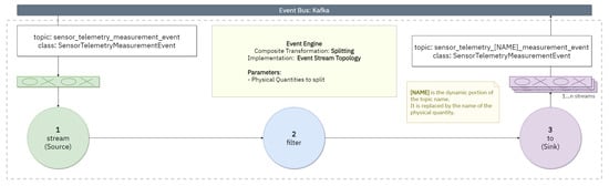 The motivation for creating the Splitting Composite Transformation is the selection of event types derived from the Ingestion Composite Transformation. That is, their separation from a single stream into distinct event streams, where each stream includes a specific type of measurement, i.e., physical quantity measurement. The specific Composite Transformation serves the requirement of creating homogenized event streams based on the physical quantity type. The user defines, as parameters, the physical quantities for which a discrete event stream must be created. The name of the topic (but also the topic itself), which includes the records of the event stream, is created dynamically. More specifically, the records of all event streams are self-contained and know certain information, such as the quantity type and others, as mentioned in previous sections. Therefore, they can feed processors with useful information to perform various processes. Each message gets the same key.