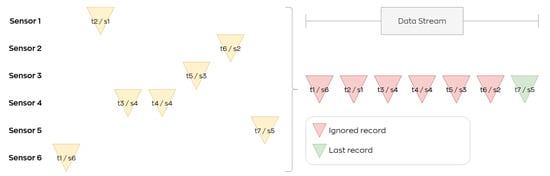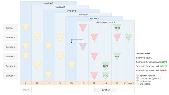 However, there is a non-ideal condition that, when satisfied, affects the timeliness of the generated temperature value. Specifically, the user makes decisions based on the ingestion timestamp instead of the event timestamp. As a result, the timestamp of the generated “meaningful” event will be the ingestion timestamp of the IoT Event. So when a sensor is late in sending data, the Event Engine produces a “meaningful” event with a correct and valid temperature value based on the concepts defined by reliability. Nevertheless, this value differs from the actual one because time has passed. It is recalled that, in any case, the user is aware of this information and can either take additional actions or wait for the next actual temperature value, which, based on this scenario, will be very soon.