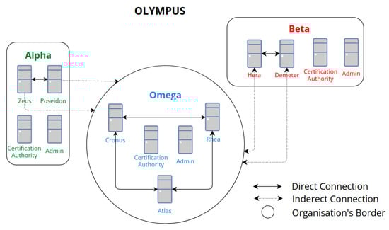 The ordering service and the peers form a Hyperledger Fabric network. In our implementation, the ordering service (machines that sort transitions and create blocks) is formed by three orderers connected. Conversely, peer nodes (machines that host ledgers and chaincode) only connect with other peers inside the same organization. The four peers (Alpha: Zeus, Poseidon; Beta: Hera, Demeter) can use any of the orderer nodes to connect to the ordering service as a whole. To interact with the ledger, the client application can invoke the chaincode using any of the four peers.