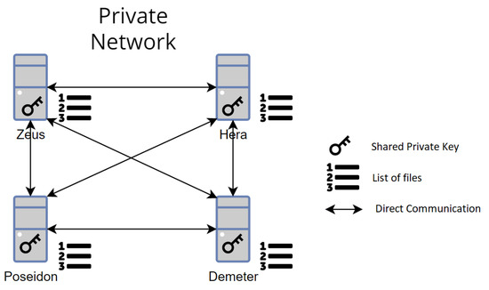 Figure 2 illustrates the Olympus IPFS network. Four peers (Zeus, Poseidon, Hera, and Demeter) are connected and share a private key to enable a private network and a cluster. Besides enabling the deletion of a file, this network architecture also enables the recovery of any file if a peer is lost.