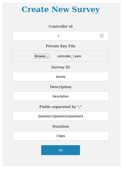 In our Proof-of-Concept (PoC), the surveys are sets of questions created by the DC with an explicit purpose and a deadline. After the DC inserts the questions, the DS can read the survey description and decide whether to participate. To comply with article 9 of GDPR, the answer to each survey must be optional and time-constrained, and all the information about a survey must be deleted after the deadline [23].