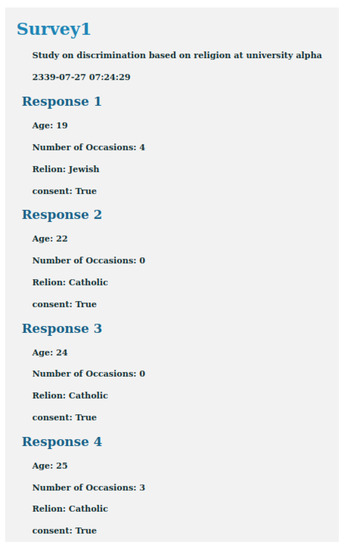 Figure 5 illustrates the information that the data processor can access when reading a survey. In this case, the DP chose to read the answers to Survey 1. The API invokes the HLF to retrieve the metadata of the survey and the list of CIDs that correspond to the files with answers to that survey. Then, it invokes IPFS to read all the files whose CID appeared in the list. The web page displays the survey metadata (ID, description, and deadline) and then each participant’s answers. However, since the identity of the participants is not stored in the IPFS, the API does not show that information, and the DP can process all the data without knowing which people participated or to whom each answer belongs.