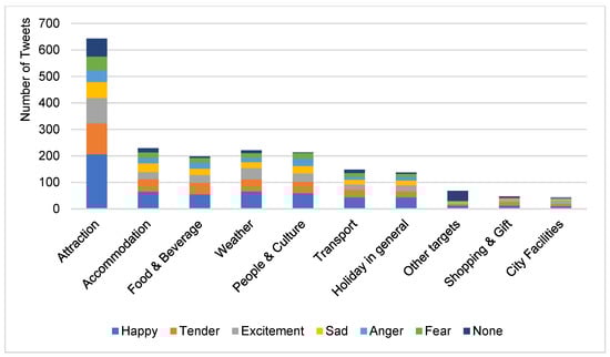 Table 2 and Table 3 are the descriptive summaries of our proposed annotation procedure. Confidence intervals (CI) with a 95% confidence level were also computed for the total number of tweets with different targets and emotions. To better understand the summaries, the pictorial presentations of the results are also provided in Figure 4, Figure 5 and Figure 6, respectively. Table 2 provides the results of the annotation process related to key targets and emotions. The far-right column presents the total numbers and percentages (with CI) of posts for ten targets (i.e., the nine key targets identified in annotation and an “other” category). The bottom row displays the total numbers and percentages (with CI) of posts conveying each emotion category. The “other” category includes targets, such as sports and events. The top three most talked about targets were attractions (manmade or natural), accommodation, and food and beverage, highlighting that these targets matter most to tourists and form the ‘backbone’ of their trip. The dominance of attraction-related posts reflects their critical role as a pull factor of a destination. In contrast, shopping and city facilities attracted little coverage, confirming earlier work by Volo [52], who did not reveal these as recurring themes in bloggers’ reported tourist experiences. From Table 2, it can further be noted that there were a total of 567 instances of positive emotions, 237 instances of negative emotions, such as sadness, anger, or fear, and 141 posts without expressing any emotions. This result confirmed that people tend to share positive experiences [21,53], but the extent to which this distribution resulted from positive bias among Twitter users requires further investigation.