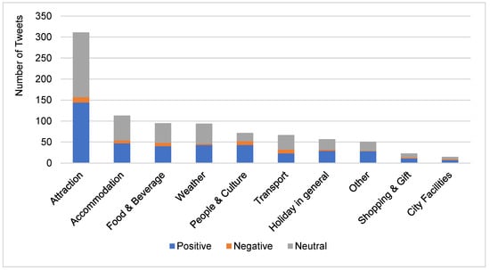 An analysis of sentiment polarity cross-referenced to targets is also provided from the annotated data in Table 3. Table 3 shows that around 35% (±4.3%) of the posts with a 95% confidence level contained neutral sentiments and the rest were either positive (58.73% ± 4.43%) or negative (5.89% ± 2.12%). Table 3 further indicates that the attraction target presented the highest share of posts across the three sentiment polarity categories. The posts with Accommodation, Food & Beverage, and Weather, as the other three targets, were also posted and shared by people in the data considered for this study. Figure 5 also indicates that posts with positive sentiment were more than the posts with negative sentiment. When interpreting the results, it is important to consider the nature and impacts of the low number of tweets in some findings and discussion around them. Particularly, findings and discussion about negative tweets in our dataset should be interpreted with precautions, as negative tweets were small in number and the negative sentiment about the “Holiday in general” target, for example, was computed based on three tweets.