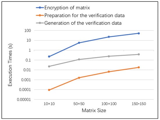 The following describes the publicly verifiable matrix–vector multiplication scheme that we use based on [], which consists of four algorithms: . Table 3 shows the data size in the scheme, and the details are given below: