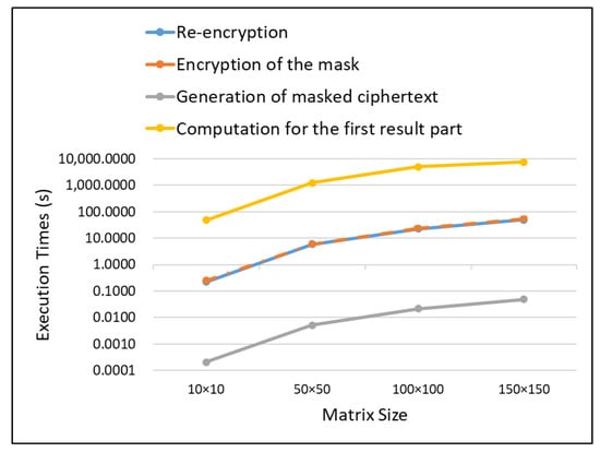 Figure 4 illustrates the time cost for . The blue line represents the time for re-encrypting the ciphertext, the red line represents the time for encrypting the mask, the gray line represents the time for generating the masked ciphertext, and the yellow line represents the time for computing the first part of the result ciphertext. As shown in Figure 4, the time for re-encryption and encrypting masks is nearly identical to that for the function owner to encrypt the matrix, and the homomorphic operations are highly efficient. The computation involving LHE ciphertexts is the most time-consuming, which would significantly burden the user if performed locally. Therefore, it was outsourced to the cloud server for computation.