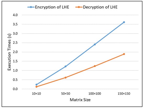Figure 5 illustrates the time cost for , where the blue line represents the time for decrypting the masked ciphertext, and the red line represents the time computing the second part of the result ciphertext. As can be seen from Figure 5, the computation with LHE ciphertexts is the most time-consuming, which is the same as , so it was outsourced to the cloud server.