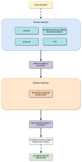 This research aims to address a gap in the literature by exploring the use of survival analysis in combination with various feature selection/analysis and machine learning methods to predict machine failure. While some studies have utilized survival analysis to predict failure, few have examined the effectiveness of different feature selection/analysis methods in conjunction with this technique. Most of the existing research focuses primarily on different machine learning models, such as LSTM networks [10,11], moving away from the survival analysis approach. While machine learning models are undoubtedly useful in predicting machine failure, survival analysis may be more appropriate when the goal is to predict failure times and identify key factors in failure prediction. In this proposed model, a machine learning survival analysis technique is used, along with feature analysis and selection methods. The machine learning model used is random survival forest (RSF), which is well-suited to time-to-event data, such as machine failure times, and has several advantages over other machine learning methods in the context of survival analysis. Examples include the ability to handle time-dependent covariates, non-linear relationships between covariates and survival, and interactions between covariates [12].
