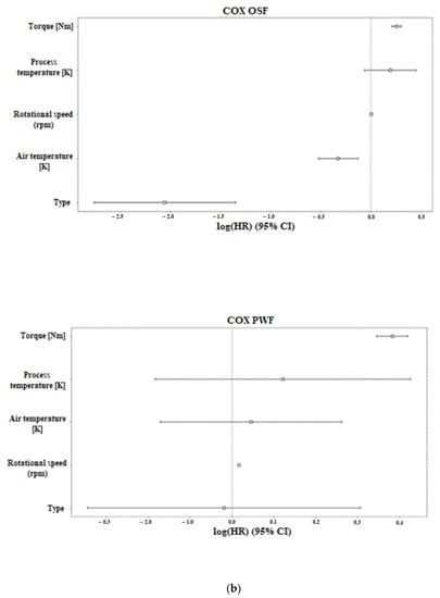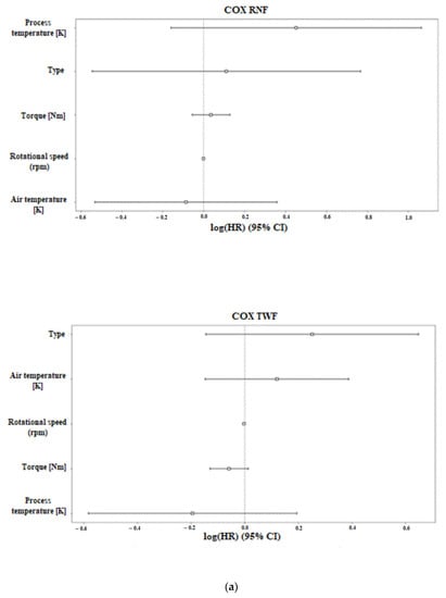 The COX and RSF methods in the feature ranking section showed that the most important features in terms of machine failure were torque, rpm, and air temperature, as shown in Figure 2 and Table 2. Specifically, in the figure and table, the ranking of the characteristics is shown for the type of machine failure. In the COX results, the values that have a negative value indicate low correlation with machine failure, while positive values indicate an increased probability of machine failure. In contrast, in the RSF results, negative values indicate that the characteristic reduces the predictive ability of the model, i.e., in this specific case, the correlation of the characteristic with a low risk of machine failure. In the case of RNF prediction, all characteristics have negative values, indicating that they are all related to a low risk of machine failure. Although this complicates the model prediction, including the context of machine failure, i.e., a random factor, it is somewhat logical.