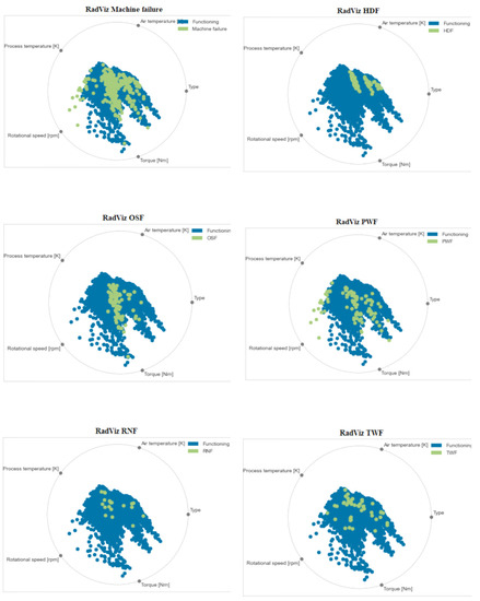 RadViz graphical representation of feature relations for different causes of machine failure.