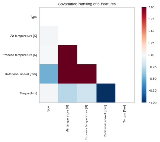 Through the analysis of 2D ranking, a strong correlation between the process and air temperature features with the rpm of the machine is observed, which is logical in the mechanical context. Additionally, increasing the rpm of the machine results in a corresponding decrease in its torque, as shown in Figure 4. Moreover, using the Pearson ranking 2D model, as shown in Figure 5, we observe an almost perfect positive correlation between the air temperature and process temperature features. This leads us to the conclusion that an increase in one of these two variables may lead to the destruction of the machine. Similarly, the almost complete negative correlation between the rotational speed and torque variables is also evident from the same diagram. This negative correlation may indicate that an increase in one of the two variables results in a decrease in the probability of machine failure. These observations highlight the importance of considering these variables in machine failure prediction models.