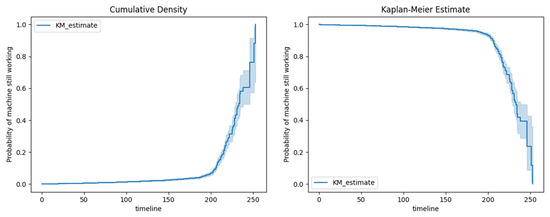 The Kaplan–Meier estimator is a non-parametric statistical method used to calculate the survival function. The survival function indicates the probability that the subject participating in the study will survive beyond a certain period [12]. In the case of this study, the event is the time until the machine ceases to function. The probability of survival for each time point is calculated using the following formula: