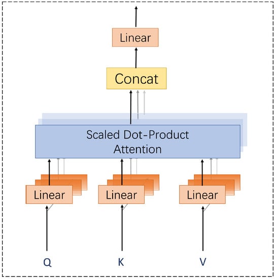 We used a multi-headed attention mechanism based on self-attention, which allows for the better extraction of multiple semantics. The structure is shown in Figure 3. The calculation equations are as follows.