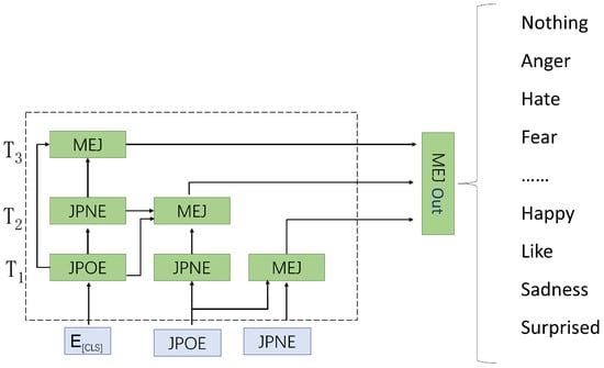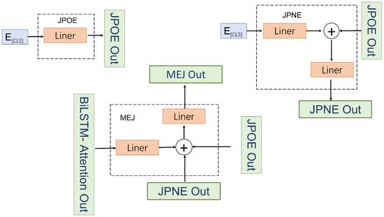 The training method is shown in Figure 6. We divided the training into three moments: , , and . The JPOE module takes the output of the [cls] character of Bert as input in the above three moments. The JPNE module takes the output of the [cls] character and the manually annotated JPOE module output label as input in moment and the output of the [cls] character and the JPOE module output in moment as input in moment . The JPOE module output in moment takes the output of the [cls] character and the JPOE module output in moment as input. The output of the [cls] character and the output of the JPOE module at time are used as inputs at time . In the third stage, , the moment for the JPOE module and the JPNE module result, is replaced with its label, and the correct value is passed on. In and , the moments for the JPOE module and JPNE module result are used as the result of the previous moment.