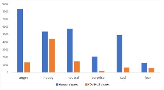 The SMP2020-EWECT dataset was provided by the Social Computing and Information Retrieval Research Center of Harbin Institute of Technology, originating from Sina Weibo and provided by the Micro Hotspot Big Data Research Institute. The dataset is divided into two parts. The first part is the general microblogging dataset. This dataset was obtained randomly from the microblogging content, without identifying specific topics, covering a wide range of subjects. The second part is the COVID-19 Weibo dataset, which contains Weibo content obtained during the pandemic using relevant keyword filtering related to the COVID-19 pandemic. Therefore, the training set of this evaluation contains the above two types of data: general microblog training data and COVID-19 Weibo training data. The test set is also divided into the general microblog test set and the COVID-19 Weibo test set. Each Weibo was labelled as one of the following six categories: neutral, happy, angry, sad, fear, or surprise. A total of 27,768 Weibo were included in the training dataset, 2000 Weibo in the validation set, and 5000 Weibo in the test dataset. The COVID-19 Weibo training dataset consists of 8606 Weibo, while the validation set contains 2000 Weibo, and the test dataset contains 3000 Weibo.
