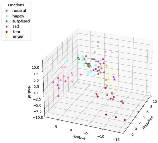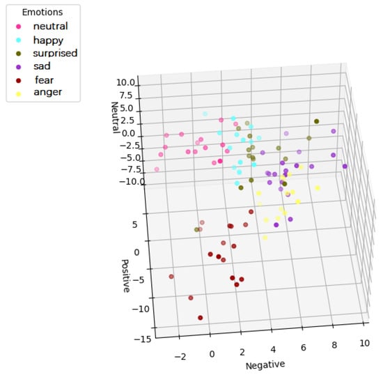 To more intuitively verify the interpretability of the model, we projected the output of JPNE in 3D space (Figure 10 and Figure 11); the x, y, and z axes represent the probabilities of negative sentiment, positive sentiment, and neutral sentiment, respectively. It can be seen that the points predicting the same emotion are much tighter. Anger, fear, and sadness belong to the same negative emotion, and they have a smaller cluster spacing.