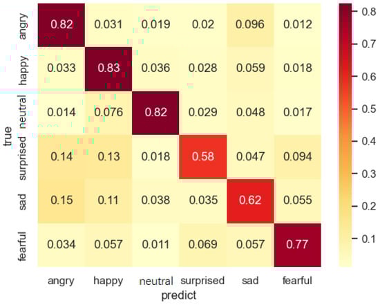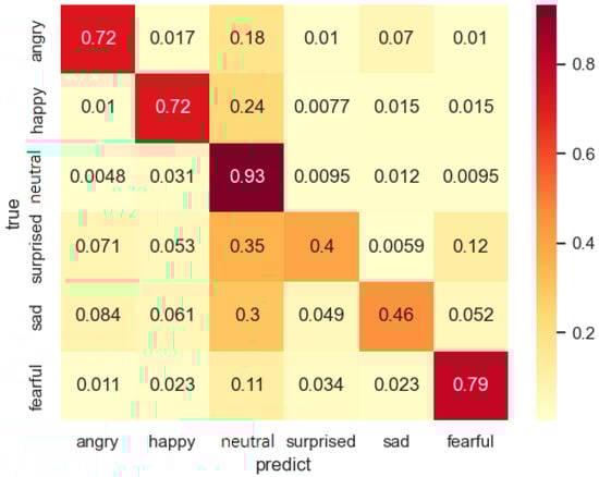 Figure 12 shows the confusion matrix of the prediction results for the normal case, and Figure 13 shows the matrix perturbed by the wrong JPNE and JPOE values, showing that the accuracy of the MEJ prediction decreases and the prediction of neutral sentiment increases after corrupting the prediction results of JPOE and JPNE. The accuracy of the other sentiments decreases because JPNE and JPOE do not provide more accurate results. This suggests that JPOE and JPNE have an effect on the prediction of MEJ.