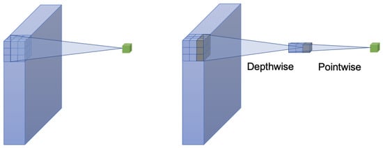 Standard convolution (left) and depthwise separable convolution (right) [33].