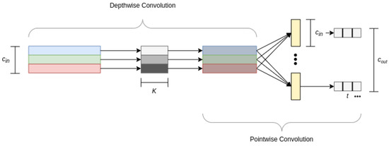QuartzNet derives from Jasper’s B × R block architecture and has the goal of achieving state-of-the-art results while using models with fewer parameters. QuartzNet performs similar operations, the only difference being the replacement of the 1D convolution with a 1D time-channel separable convolution (compared in Figure 2). The 1D time-channel separable convolution is an implementation of depthwise separable convolutions which can be separated into two other convolutions, a 1D depthwise convolution and a pointwise convolution (see Figure 3). The 1D depthwise convolutional layer performs convolutions across time, and a pointwise convolutional layer performs a 1 × 1 convolution across features/channels [6,32], which enables the QuartzNet architecture to achieve state-of-the-art results while drastically reducing the number of parameters.