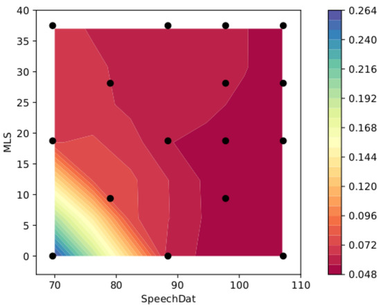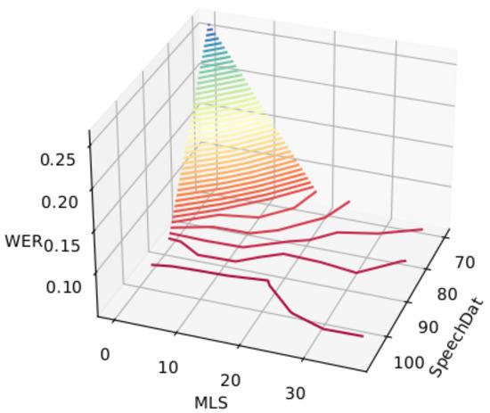 In order to evaluate this transfer learning domain adaptation, we proceeded with the addition of new combinations of MLS and SpeechDat datasets to add to the mixed datasets present in Table 11. These were used to train models using transfer learning. All combinations of the datasets and the corresponding WER performances can be seen in Table 14. These results correspond to the best performance attained for each (MLS, SpeechDat) mixture and cover 16 different points in the (MLS, SpeechDat) space where the number of MLS instances, n is in the range and SpeechDat in the range . The results are depicted in Figure 4 and Figure 5.
