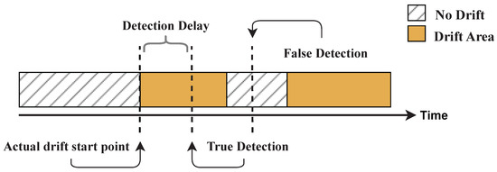 In Figure 1, the calculation of the detection delay is illustrated as the difference between the exact onset point of each drift (true detection) and the point at which it was detected by the algorithm, as described in the work by Asghari et al. [32]. Notably, when detection occurs outside of the drift area, it is disregarded and excluded from any calculations related to detection delay metrics.