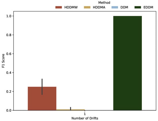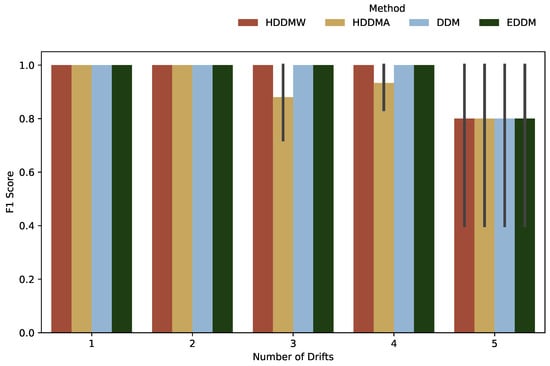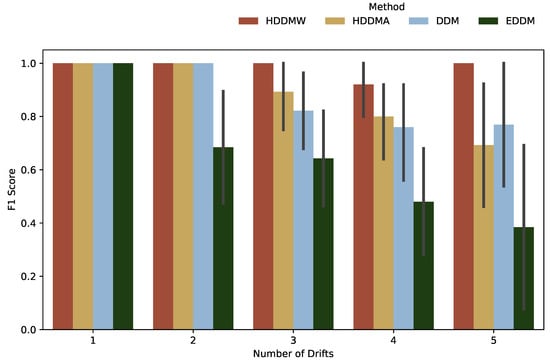 The detection performance for gradual drifts is presented in Figure 4. When the amount of drifts is 1 or 2, all algorithms yielded an identical performance, as evidenced by their respective F1 scores close to 1. However, when the number of drifts is increased to 3 or 4, the HDDMW, DDM and EDDM algorithms maintained their performance levels, while the HDDMA algorithm exhibited a decrease in its average F1 score. For five drifts, all four algorithms achieved equitable performance levels, exhibiting F1 scores of approximately 0.8. The overall results show that HDDMW, DDM, and EDDM algorithms showed equivalent performances, while the HDDMA algorithm demonstrated an inferior performance.