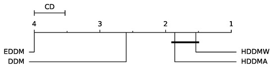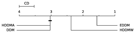 We evaluate the drift detection performance in terms of F1 score based on a statistical analysis grounded on the non-parametric Friedman statistical test [33] to determine any significant differences among EDDM, DDM, HDDMW, and HDDMA with 300 streams. Following the Friedman test, we performed a Nemenyi post hoc test [34] with a significance level of 0.05. The null hypothesis posits that the drift detectors’ performances are comparable based on the average F1 score per stream. If the null hypothesis is rejected, the Nemenyi post hoc test can be used. This test establishes that the performance of two detectors is significantly distinct if the average ranks differ by at least a critical difference (CD) value. Figure 5 shows the CD diagram for the F1 score. Particularly, we assume that there are no significant differences between HDDMA and DDM. All other differences are significant. In other words, EDDM was statistically the most accurate method, followed by HDDMW. HDDMA and DDM are statistically similar.