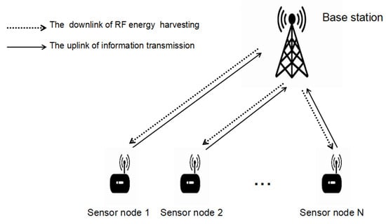 In our system, both the HDT and HHT protocols utilize time division multiplexing technology. We assume that the channel variation between any two sensor nodes and the BS follows Rayleigh block fading and is affected by additive white Gaussian noise. We also assume that the channel state remains unchanged during a fixed period of energy harvesting and packet transmission, and that each transmission time is relatively independent. Rayleigh fading has been widely accepted as a reasonable signal propagation model and an effective model for complex environments. Given the complexity of our environment, we have chosen to model the channel fading between the sensor nodes and the BS in our system using the Rayleigh communication model. After conducting a rigorous analysis, we have considered a relatively reasonable system model, as shown in Figure 1. Our system model comprises a BS and multiple sensor nodes that are responsible for both energy harvesting and information transmission. These nodes harvest energy from the BS and use it to transmit packets to the BS, thus completing the system model. To optimize the energy harvesting and information transmission processes, we install antennas for the BS. M antennas are used for uplink data packet transmission, while the remaining antenna is dedicated to downlink energy harvesting, which enables the BS to obtain energy from the nodes.