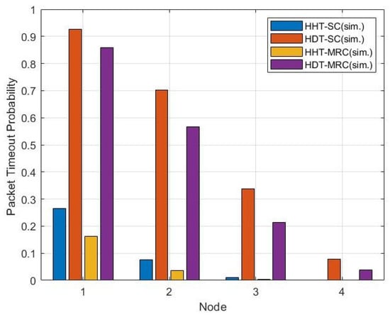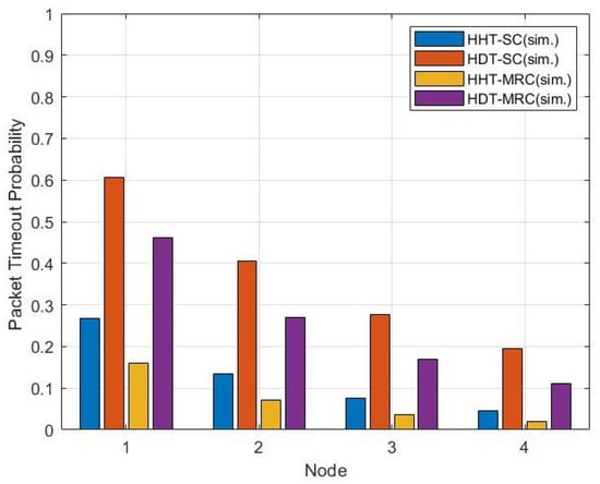 In Figure 4, we analyze the impact of different distances between the BS and the sensor nodes on the packet timeout probability. We set the coordinates of the four nodes as , , , and . The energy-harvesting time of the HHT protocol is , while that of the HDT protocol is . The packet transmission time for both protocols is . According to our observation, node 4 performs the best out of all nodes, due to its lowest packet timeout probability. This is the case since node 4 can harvest the most energy and has more energy available for packet transmission because of the fact that the distance between it and the BS is the shortest. Furthermore, we note that the packet timeout probability under the HHT protocol is consistently lower than that under the HDT protocol for all nodes. At the same time, under the same conditions, the packet timeout probability using MRC technology is lower than that using SC technology. This is because MRC selected the maximum value of channel gain, which has a higher channel gain than the average value of channel gain selected by SC. Additionally, the packet timeout probability of the MRC technology in the HHT protocol is lower than that of the SC technology in the HHT protocol, and the system performance of the HHT protocol using MRC technology is the best under the same distances.