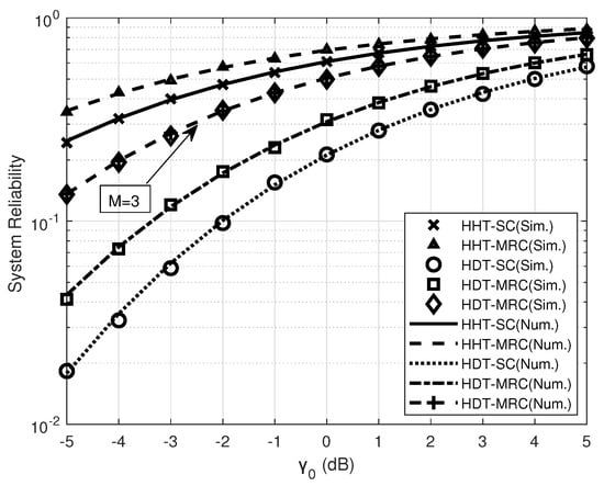In Figure 6, we investigate the system reliability of the HHT and HDT protocols. where the information transmission time is , the coordinates of the sensor nodes are set to [], and the energy-harvesting time for the HHT protocol and the HDT protocol is and , respectively, and the energy-harvesting efficiency is . The figure clearly indicates that as SNR increases, so does the system reliability. This is because an increase in SNR results in more energy being harvested by sensor nodes, which is then used for uplink information transmission, resulting in improved system performance. Furthermore, we observe that the system reliability of the HHT protocol is higher than that of the HDT protocol at the same SNR. This is due to the fact that the HHT protocol harvests energy at the head of each segment, which is less affected by channel status than the HDT protocol, which harvests energy at the head of the total period. Similarly, we also found that under the condition of HHT protocol, the system reliability using MRC technology is better than that of using SC technology. This is because the MRC selects the maximum value of the channel gain, which has a higher channel gain than the average value of the channel gain selected by the SC, which results in the system being able to harvest more energy for information transmission. We can also observe that increasing the number of antennas from to increases system reliability by utilizing the HDT protocol with MRC technology.