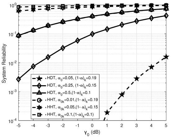 Figure 7 depicts the impact of energy-harvesting time length on the system reliability of the HHT and HDT protocols in the complete system. We fix energy-harvesting efficiency as , and the coordinates of the sensor nodes are set to . The figure shows that extending the energy-harvesting time increases the system reliability. This is because the sensor nodes can obtain more energy from the BS, reducing the data packet loss rate during data transmission and improving system performance. Furthermore, we have consistently observed that the HHT protocol outperforms the HDT protocol in terms of system reliability regardless of the energy-harvesting time length. This is because the HHT protocol uses a more reasonable time allocation method, allocating energy-harvesting time at the head of each time slot, and is less affected by complex channel environments. Additionally, the HHT protocol utilizes MRC technology, which results in the highest system reliability and best system performance.