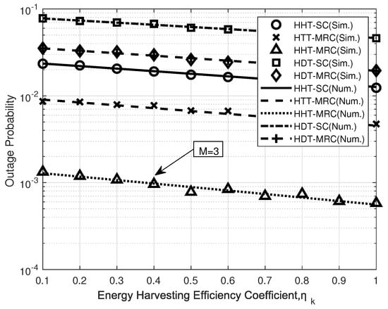 Figure 8 shows how the energy-harvesting efficiency coefficient affects the probability of a system outage in our wireless communication system. Specifically, we fix the energy-harvesting time for the HHT and HDT protocols at and , respectively, and set the information transmission time as . The energy-harvesting efficiency is held constant at . Our simulation results demonstrate that increasing the energy-harvesting efficiency leads to a continuous decrease in the outage probability in our wireless communication system, as shown in Figure 8. Furthermore, the HHT protocol consistently outperforms the HDT protocol in terms of lower outage probability. This superiority can be attributed to the fact that the HHT protocol harvests energy at the beginning of each time slot, which is less susceptible to channel fading. Consequently, more energy is available for information transmission, resulting in a reduced outage probability. Additionally, we discovered that when the number of antennas is increased from to , the probability of a packet outage is greatly reduced because doing so enables the system to obtain greater diversity gain. Therefore, based on our simulation results, we can conclude that the HHT protocol is a preferable option for energy harvesting in wireless communication systems, as it achieves better system performance compared to the HDT protocol.
