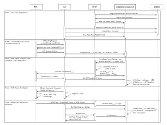 This local authentication of the mobile number also avoids the spamming of mobile users or blockchain data. For example, if the local authentication of a mobile number is not concluded successfully, spammers may create millions of offload requests using random mobile numbers, which in turn would create a corresponding number of open smart contracts, and force denial of service attacks against legitimate users. The smart contract module allows the WP to create a new smart contract and set its variables based on the subscriber authentication mechanism. Once the subscriber is allowed to offload and subsequently terminates their connection, the billing module records the data usage and writes this as a new transaction to the blockchain. Figure 2 details the various phases of the offloading framework.