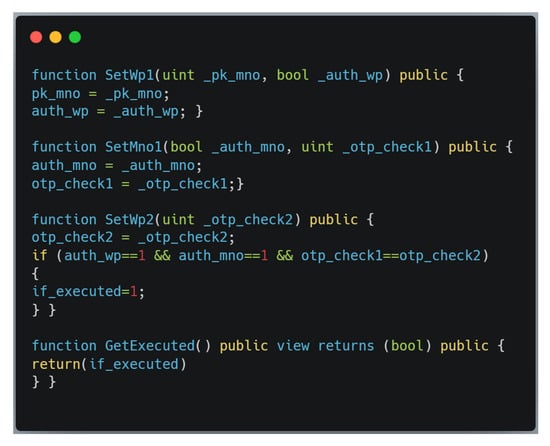 Once the MN receives , the mobile app enters it into the next field on the landing page of the WP. The WP in turn assigns the value to the field of the smart contract. Now, if the values of and are both equal to 1, the blockchain deduces that both the WP and MNO have validated the subscriber’s identity. If the and are the same, it means that the subscriber is authorized to offload, and the smart contract has been executed on the blockchain. The smart contract can also include other information, such as the total time allowed to offload, or any other conditions with the associated offload which need to be honoured by all the parties. The smart contract functionality is implemented in Solidity, and code snippets for various functions are shown in Figure 3.