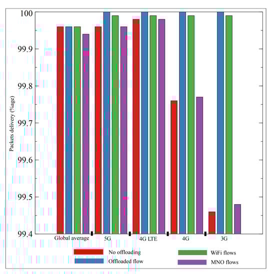 For the global average case, the packet delivery percentage is the same for all cases except for the MNO flows; however, this difference is insignificant. In this case, 99.96% of packets are delivered for non-offloaded flows, offloaded flows, and WiFi flows, whereas 99.94% of total packets are delivered for the MNO flows. For all other case studies, it is evident from Figure 4 that 100% of offloaded flows are delivered, primarily because of the enhanced data speed of the WiFi link. A slightly smaller number of packets are delivered in the global average case study, compared with all other case studies, because the fixed broadband speed of the global average is lower when compared with other case studies. As the data transfer speed decreases in the 4G and 3G case studies, we can see an increase in packet drop ratio for non-offloaded and MNO flows. If these flows are offloaded to the WiFi network, then the packet delivery ratio rises to a better quality of service requirement.