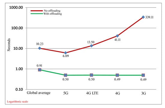 Figure 5 displays the time taken to deliver a 500 MB file, and a total of 10 such requests are made for each WiFi and MNO network. One request to transfer a 500 MB file is then offloaded to a high-speed network. From this figure, it is evident that the time taken to transfer files is significantly reduced in the case of the offloaded flow. In the global average case study, the non-offloaded flow takes 10.23 s to transfer one file, whereas the time is reduced to 0.91 s if the request is offloaded. Similarly, the graph shows a drastic reduction in delivery time in all other case studies. The longest time taken is 339.11 s by the 3G network to deliver the file; this time is reduced to only 0.49 s if this flow is offloaded to the WiFi network.
