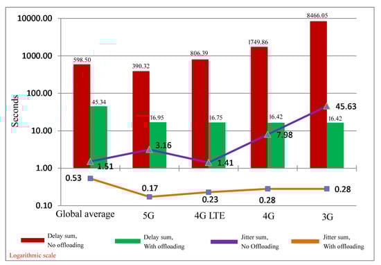 Figure 6 presents the analysis of delay sum and jitter sum for all the case studies. The delay sum is the addition of all delays for each packet for the full duration of the flow, whereas the jitter sum is the addition of all jitter for every packet for any particular flow. For the global average, the delay sum is calculated as 598.50 s. For other case studies, such as 5G, 4G-LTE, 4G, and 3G, it is computed as 390.32, 806.39, 1749.86, and 8466.05, respectively, for the non-offloaded flows. If compared with the delay sum obtained by the offloaded flows, we can see a drastic reduction. The delay sums obtained for the offloaded flows are 45.34, 16.95, 16.75, 16.42, and 16.42 for the global average, 5G, 4G-LTE, 4G and 3G.