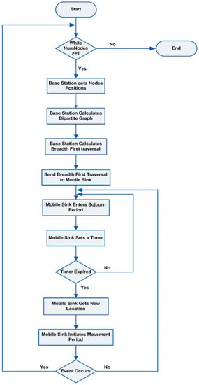 Furthermore, the mobile sink’s movement will follow the breadth traversal of the nodes in the selected set and is divided into sojourn periods and movement periods. In the sojourn period, the mobile sink will pause in its current location for a specific period. After that, it will begin moving toward a new location at a set pace. When the mobile sink arrives at the new location, the sojourn period begins again and stays in the new place for the same period. A flowchart of the mobility model suggested in this paper is shown in Figure 2.