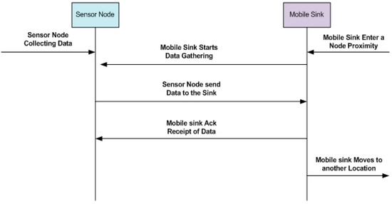 Consequently, by adopting this approach, the mobile sink will be able to visit nodes that are not neighbors to each other and collect data from the neighbors of the node being visited. It can also be observed that static sensor nodes will have multiple chances to report their data to the mobile sink, especially with multiple neighbors. As a result, up-to-date data will be collected from sensor nodes promptly. The chances of sensor nodes suffering from buffer overflow are reduced because static sensor nodes do not have to store the collected information for long, waiting to be visited by the mobile sink. Figure 3 shows a message flow diagram presenting the communication between the sink and the sensor nodes.