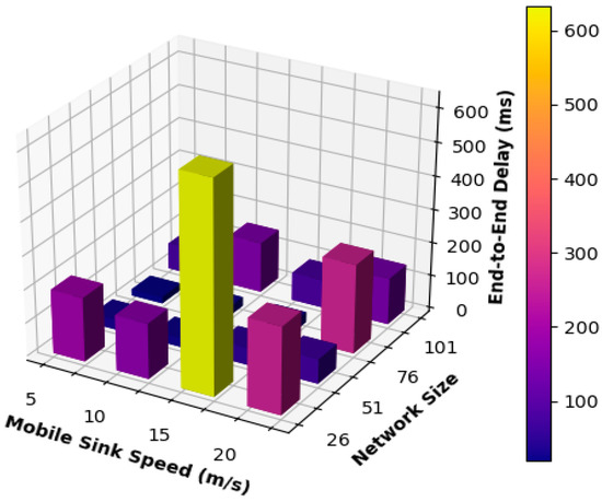 On the other hand, when increasing the speed of the mobile sink to 20 m/s, these networks obtained higher end-to-end delay results because 20 m/s is considered a high speed and may cause frequent changes in the routing paths used to convey messages to the mobile sink. As a result, a packet may go through unnecessary hops to be delivered to the mobile sink.