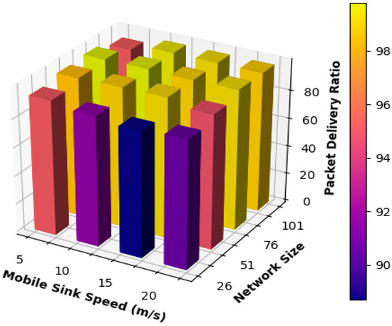 The results acquired for the packet delivery ratio are shown in Figure 5, which shows that the proposed mobility model obtained highly stable performance under all network sizes. The networks with 51 nodes and 76 nodes achieved the highest performance results regarding packet delivery ratio when the mobile sink speed was equal to 5, 10, and 15 m/s, consistent with the results from Figure 5.