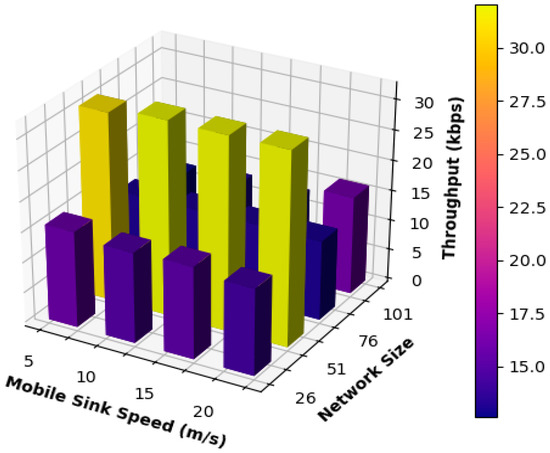 Figure 6 shows the results obtained for network throughput when the mobile sink moved following the suggested mobility model at various speeds and with varying network sizes.