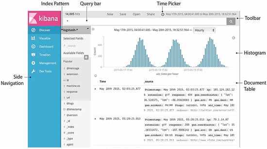 - Bajer, M. Building an IoT data hub with elasticsearch, Logstash and Kibana. In Proceedings of the 2017 5th International Conference on Future Internet of Things and Cloud Workshops (FiCloudW), Prague, Czech Republic, 21–23 August 2017; pp. 63–68. [Google Scholar] [CrossRef]