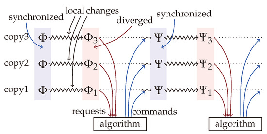 The synchronization paradigm used in this paper follows the traditional one described in, for example, [17] and depicted in Figure 1. At the beginning of the synchronization cycle, each replica stores an identical copy of the same filesystem . Due to local modifications, the replicas diverge, and after some time, the filesystem in the i-th replica changes to . At a certain moment, the replicas call for synchronization by sending information extracted by the update detector (run locally) to a central server, which hosts the reconciliation algorithm. After the server has received all update information, it determines what the common synchronized filesystem will be. Then, it sends instructions to the replicas separately telling them how to transform their local filesystem to the synchronized one. Finally, each replica executes the received instructions, which transforms their local copy to the synchronized state , optionally informing the user about some (or all) of the conflicts and how they have been resolved.